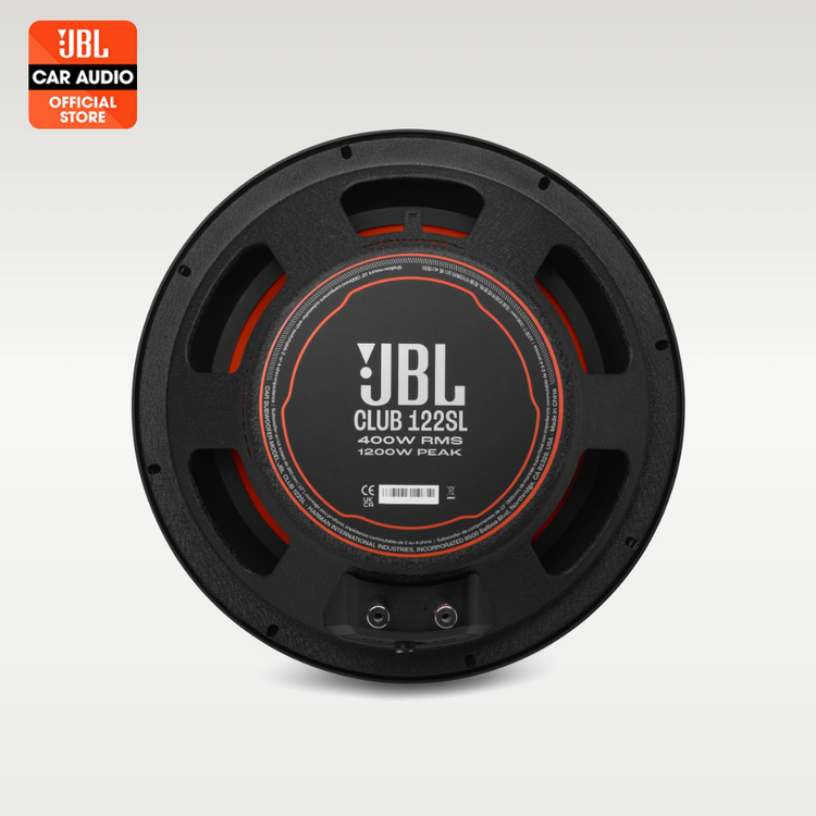 JBL Club shallow-mount subwoofers feature a large inverted dust cap mated to a JBL orange cone with a subtle reveal for a pop of color. The slash pattern forms a JBL Horn prominently on the dust cap. The unique surround design allows the trim ring to press fit into it and conceal any fasteners. This gives the subwoofers a sleek clean appearance when installed.